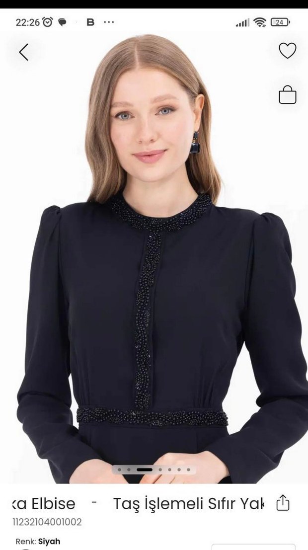 Siyah, işlemeli ve boncuk detaylı, uzun kollu, yakalı, klasik şıklıkta iş için uygun uzun boy elbise.