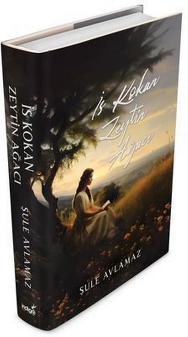Şule Avlamaz'ın "İs Kokan Zeytin Ağacı" adlı romanı, gün batımında zeytin ağacı altında kitap okuyan bir kadını gösteren huzurlu kapak tasarımına sahiptir.