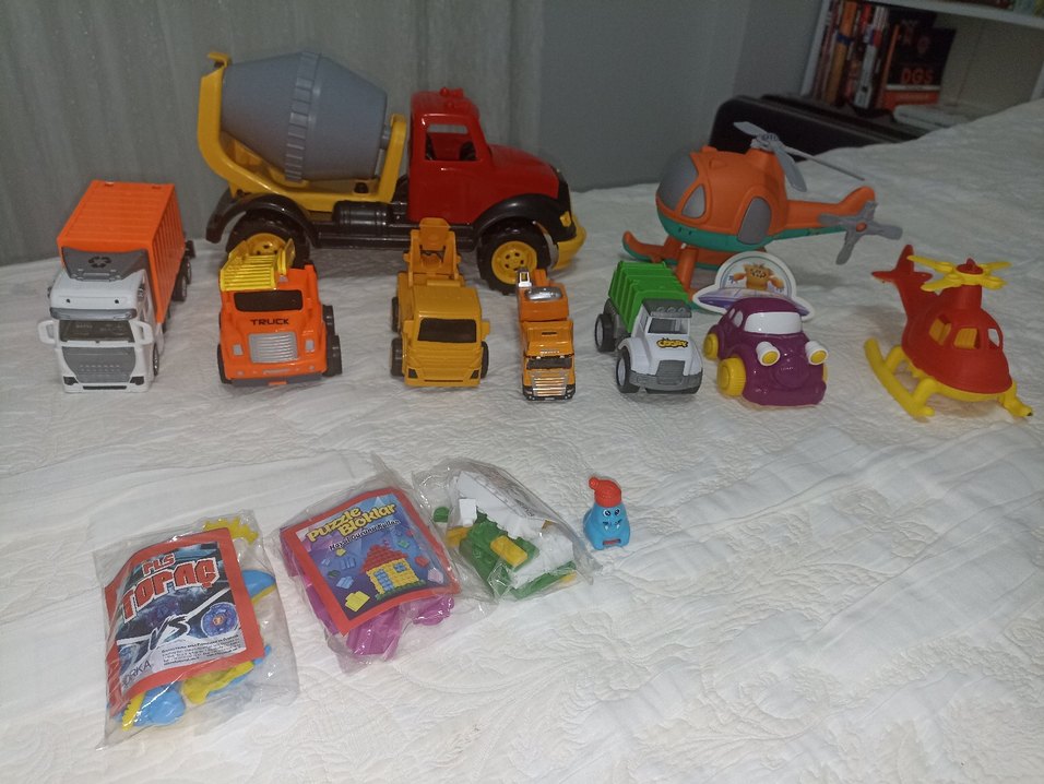 İş Makineleri , kamyon , araba , helikopterler , topaç ve küçük LEGO seti. toplamda 13 parçadır.Her açıdan fotoğraf çekilmiştir. #kamyon #ismakinesi #oyuncak #helikopter #araba #lego #topac