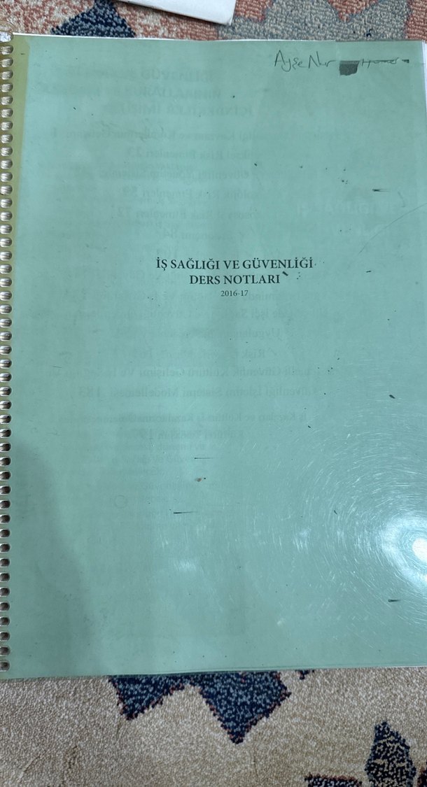 2016-17 akademik yılına ait iş sağlığı ve güvenliği ders notlarını içeren spiralli defter.
