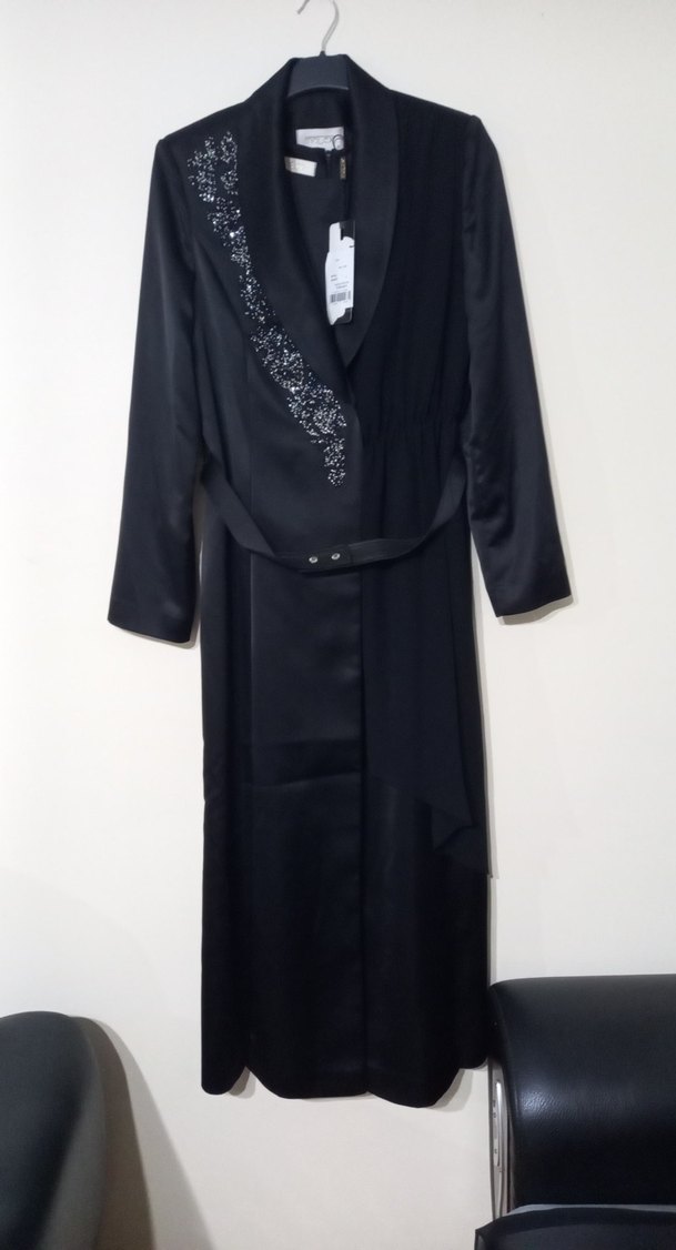 Siyah uzun kollu, nakış detaylı kadın elbisesi, iş tarzı ve gotik stilin birleşimiyle düzenli kesime sahip, uzun boylu şık bir modeldir. Armine mağazasından sol kol iplik kaçağı var