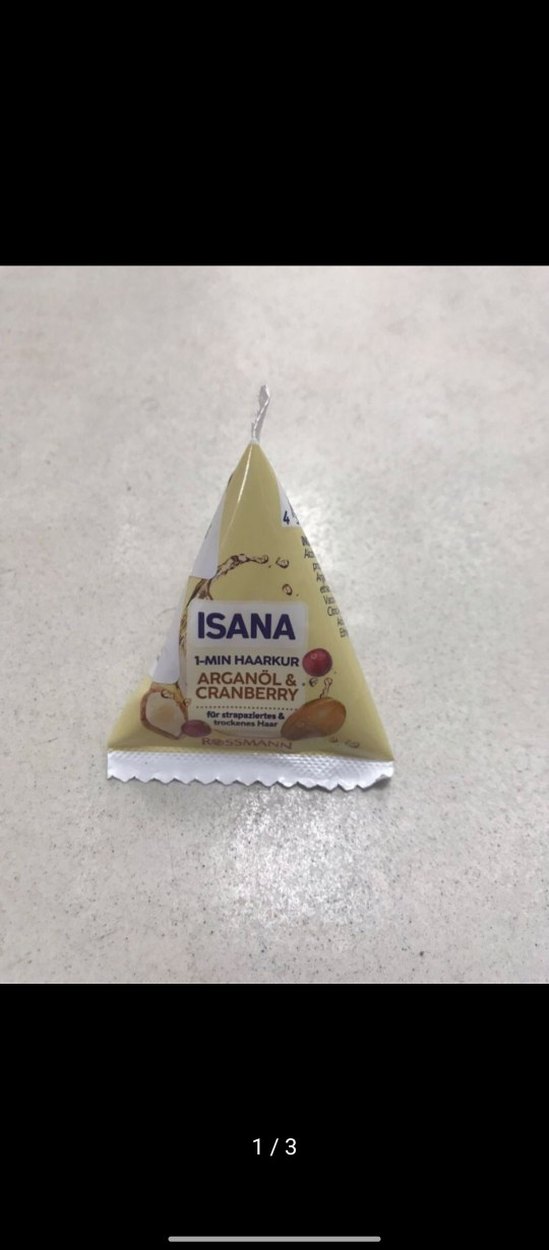 Isana 1 dakikada etki eden argan yağı ve cranberry içeren saç maskesi, yıpranmış saçları besler ve güçlendirir.