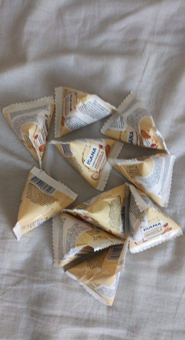 Isana saç kremi numuneleri, küçük üçgen paketlerde tek kullanımlık. Ürünü denemek için uygundur.