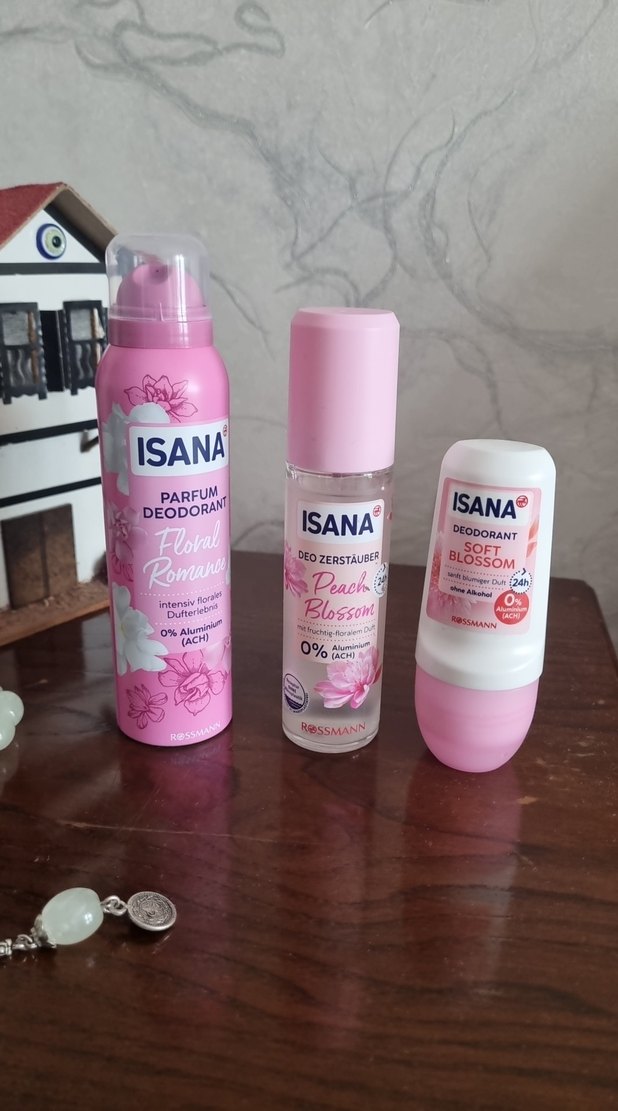 ISANA kadın deodorant seti; floral romantic sprey, peach blossom mist ve soft blossom roll-on içerir. Alüminyum tuzu içermez.