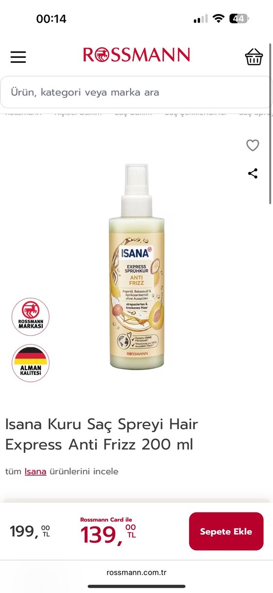 Isana Express Anti Frizz kuru saç spreyi, hafif formülüyle kuru saçları düzeltir ve korur. Elektriklenmeyi azaltır, parlaklık verir.✨
