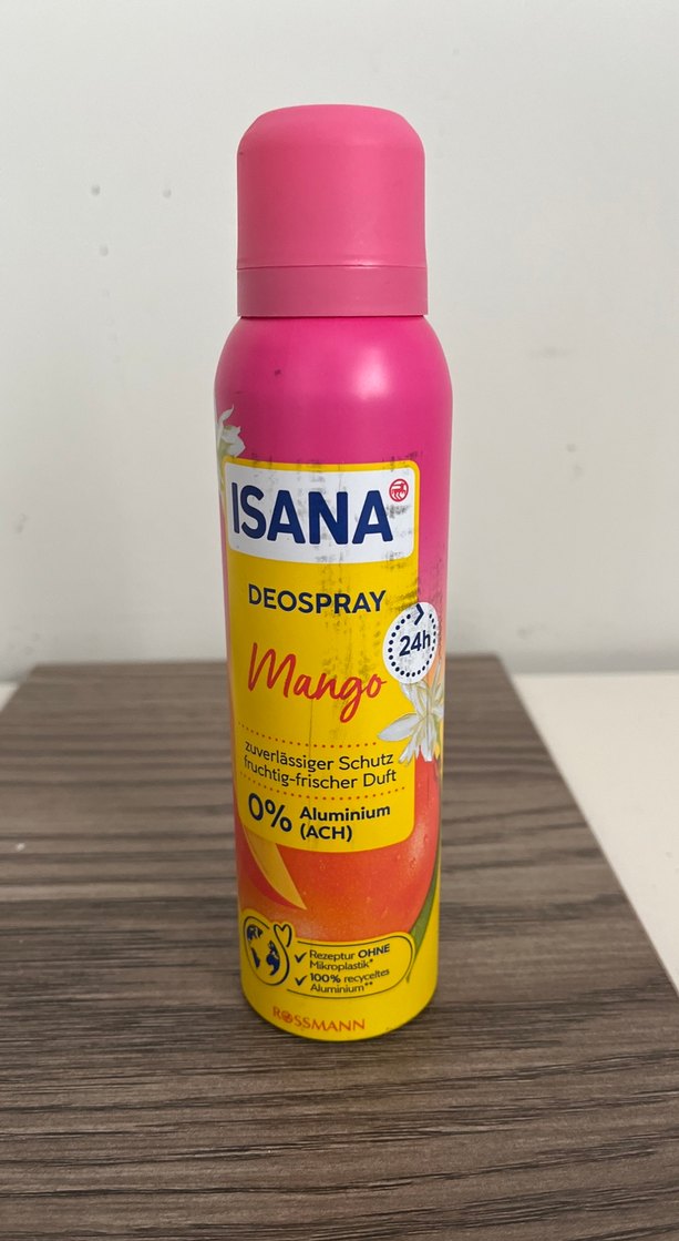 Isana Mango kadın deodorant spreyi, 24 saat koruma sağlar ve taze meyveli kokusuyla 0% alüminyum içermez.