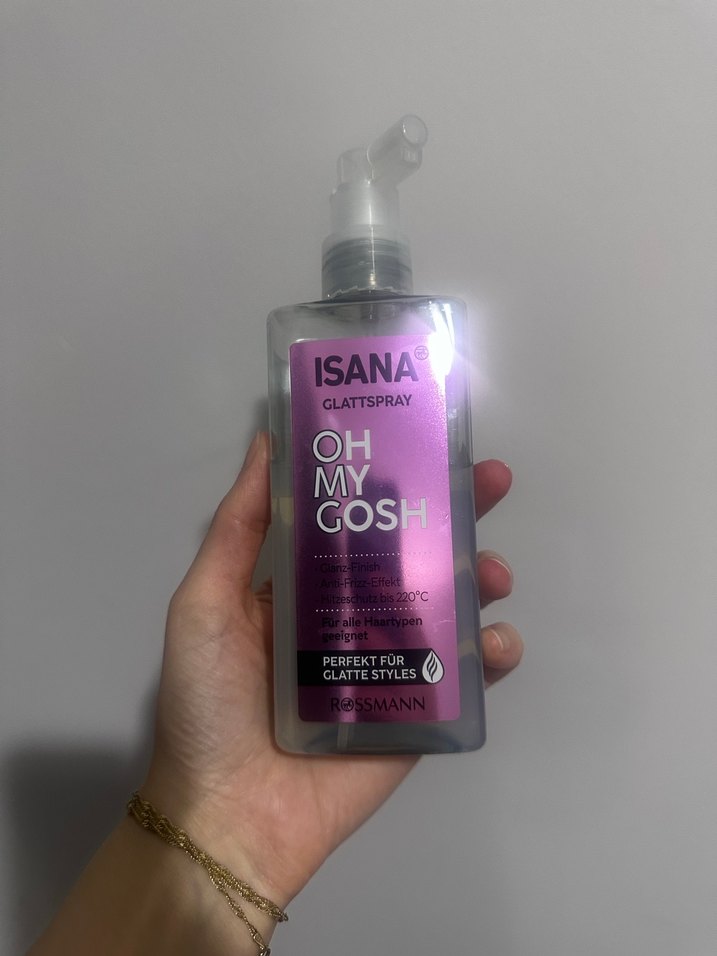 Isana Oh My Gosh saç düzleştirici sprey, saçı 220°C'ye kadar korur ve düz stiller için uygundur. Pratik sprey şişesinde sunulur. ♀️