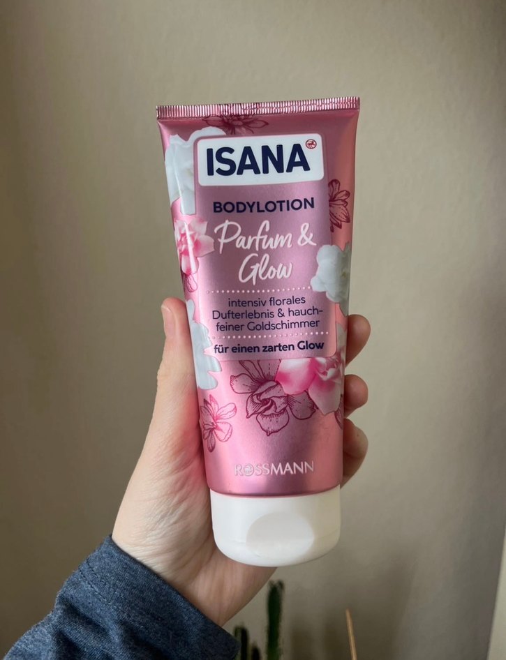 Isana Parfümlü Glow Vücut Losyonu, yoğun çiçeksi koku ve ince altın simleriyle cilde narin bir ışıltı verir. Rossmann ürünü. ✨