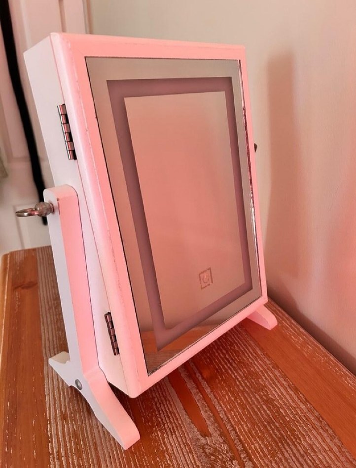 Işıklı Ayarlanabilir çerçeveli, beyaz renkte masaüstü aynalı dolap.Modern tasarıma sahip, sağlam bir destek ayağı bulunur. Ölçüleri görseller de mevcut.