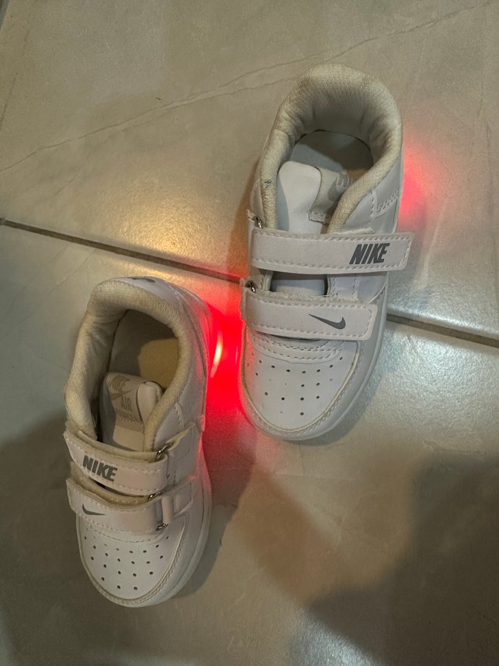 Beyaz, baskılı detaylara sahip erkek çocuk spor ayakkabısı. Kauçuk tabanlı ve NIKE logosu bulunan, velcro bantlı ve ışıklı tasarım.bir iki kez anca giyilmiştir yeni gibi duruyor.Işıkları çok canlı.