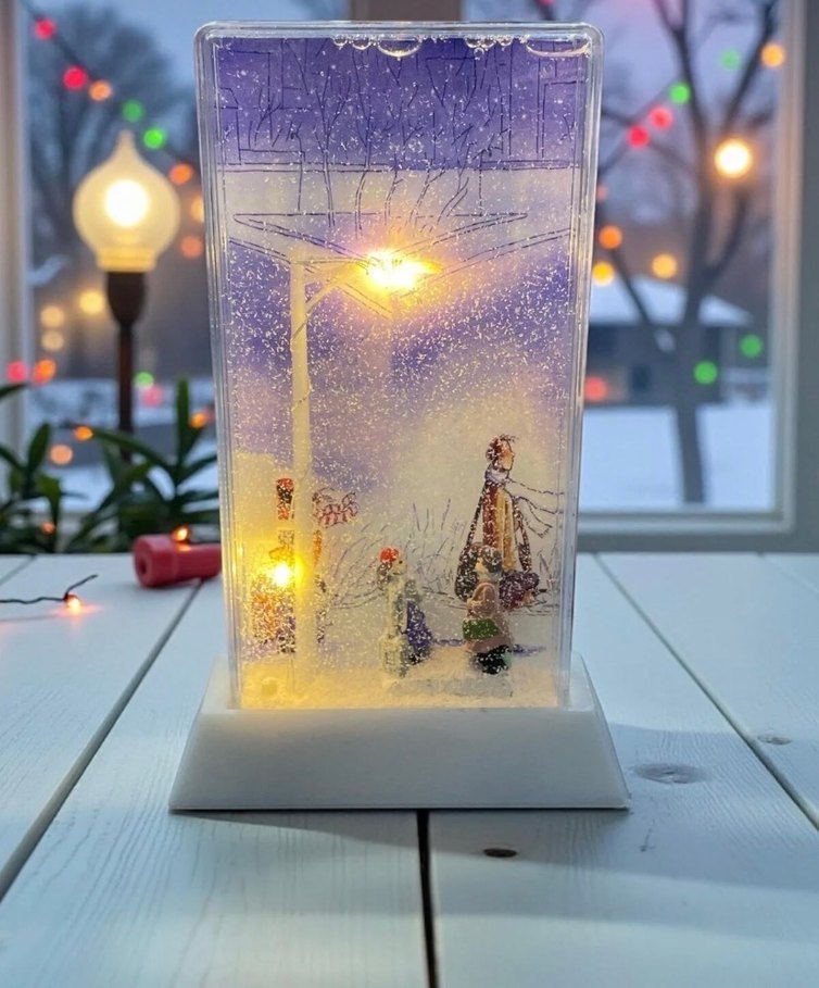 Bu beyaz figür, ışıklı kış sahnesiyle sıcak bir atmosfer yaratıyor. Sokak lambası altında kar yağışı eşliğinde insanlar yer alıyor. ❄️ Ürün sıfır kutulu şekilde gelir