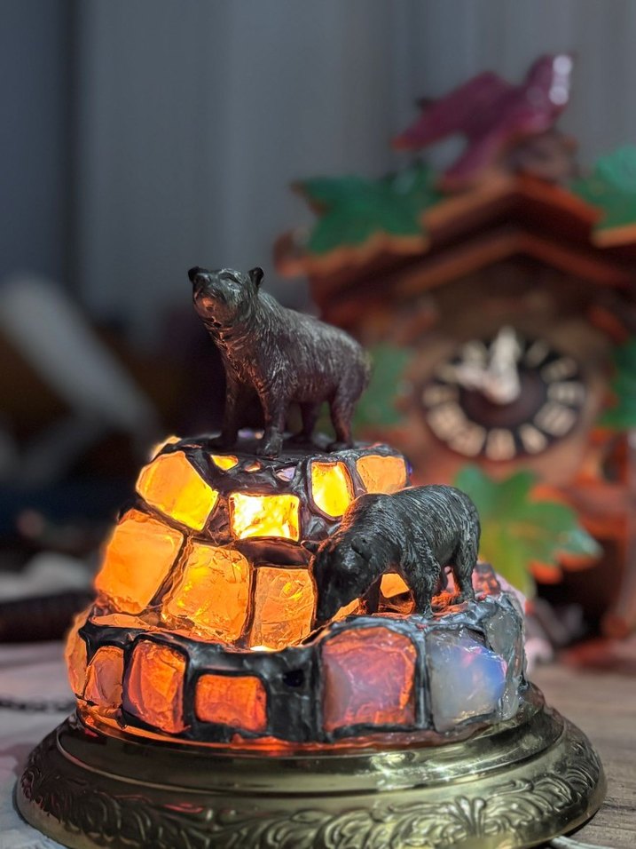 Işıklı, çok renkli taban üzerinde iki koyu renk ayı figürlü dekoratif obje, sıcak bir atmosfer yaratır.