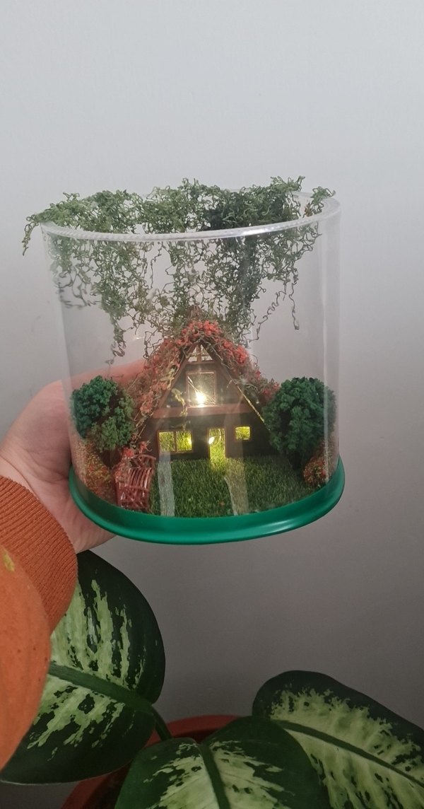 Yeşil tabanlı, içinde küçük ev ve bitkiler bulunan mini teraryum ev dekoru. arkasında pil girisi vardır saat pili ile calisir. şeffaf pleksidir dışı. kendi ürünüm.