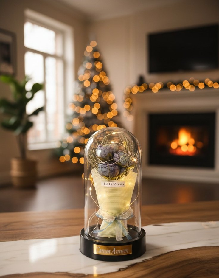 Annenize olan sevginizi her an hatırlatacak, masalsı bir hediye! Bu özel tasarım cam fanus, içinde barındırdığı zarif turkuaz güller ve sıcak LED ışıklarıyla hem gündüz dekoratif bir obje hem de gece huzur veren bir gece lambası görevi görür. Zarif Tasarım: Estetik turkuaz renkli yapay güller, yeşil garnitürler ve şık bir fiyonk ile elde hazırlanmıştır. Mesaj Detayı: Fanus içerisinde "İyi ki Varsın" ve taban kısmında altın sarısı plaka üzerine yazılı "Canım Annem" ibaresi yer almaktadır. EBATLARI YÜKSEKLİK 22CM GENİŞLİK 12 CM Sıcak LED Aydınlatma: Fanus etrafını saran mikro peri LED ışıklar, ortama yumuşak ve loş bir hava katar. Dayanıklı Malzeme: Yüksek kaliteli şeffaf cam fanus ve sağlam siyah dekoratif taban. Kullanım Alanı: Baş ucu lambası, kitaplık dekoru veya ofis masası aksesuarı olarak idealdir.