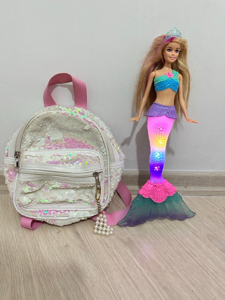 Işıklı çok renkli kuyruğa sahip deniz kızı bebek ve pembe askılı, pullu küçük beyaz sırt çantası seti. Bebek mavi üst ve taç takıyor. ♀️