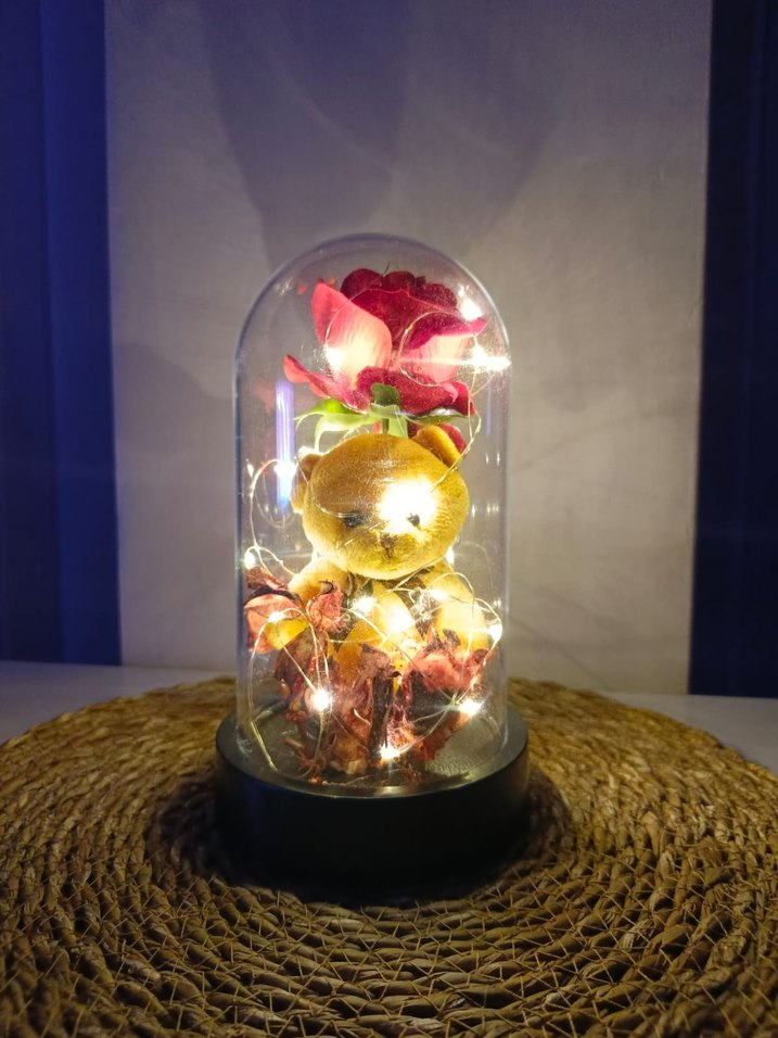 Işıklı Fanus Ayıcık ve Çiçek Dekoru