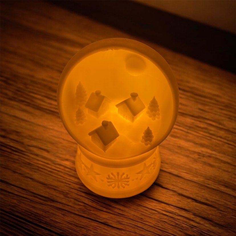 Evler ve ağaçlar içeren, sıcak ışıkla aydınlatılan bej renkte kar küresi şeklinde biblo. ❄️ 10 cm boyunda #hediyelik masalarınızda kullanabileceğiniz led mumla aydınlatan şık bir tasarım