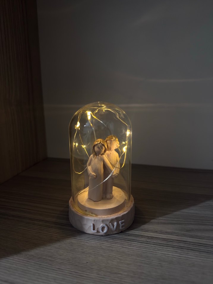 Sıcak sarı ışıklarıyla masalsı bir hava katan “LOVE” fanus İçinde birbirine sarılan çift figürüyle romantik, sade ve şık bir dekor parçası. Yılbaşında, sevgililer gününde ya da özel günlerde anlamlı bir hediye Tam çalışır durumda, dekoratif ışıkları yanıyor.