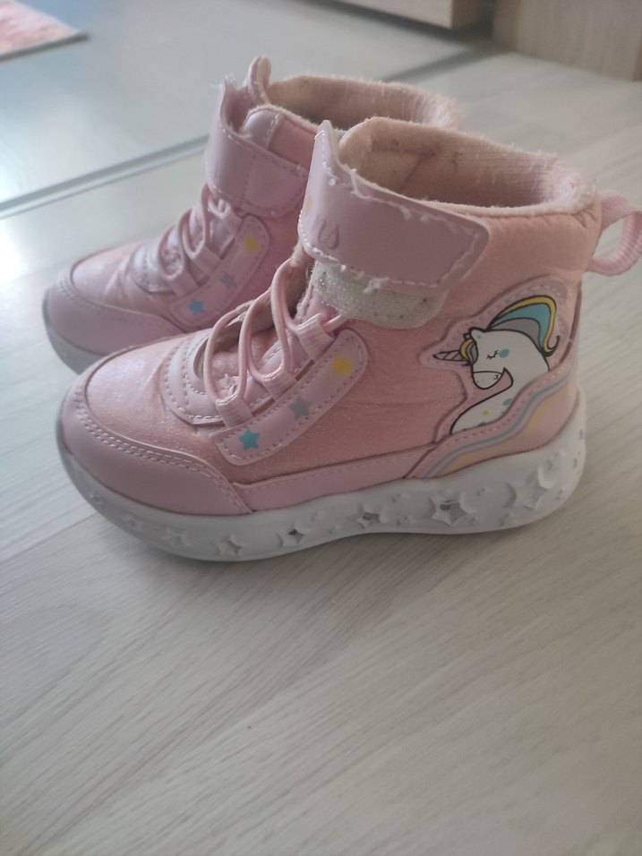 Unicorn baskılı, cırt cırtlı pembe kız çocuk sneakers. Kauçuk malzemeden, sokak stili ve yeşil ışıklı tabanlı.