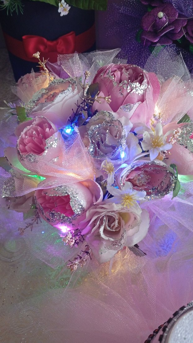 Pembe renkli, ışıltılı ve tül detaylı gelin buketi, renkli LED ışıklarla bohem ve avangard bir tarz sunar.