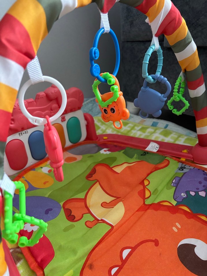 Renkli plastik oyuncaklar asılı olan bu bebek oyun matı, canlı desenlere ve yumuşak yüzeye sahiptir. ışıklı piyanolu oyun halısı oyuncaklarıyla birlikte verilecektir hiç bir sorunu yok gayet temiz sadece oyuncakların asılı olduğu yerde ufak bir sökük var kolayca dikilebilir