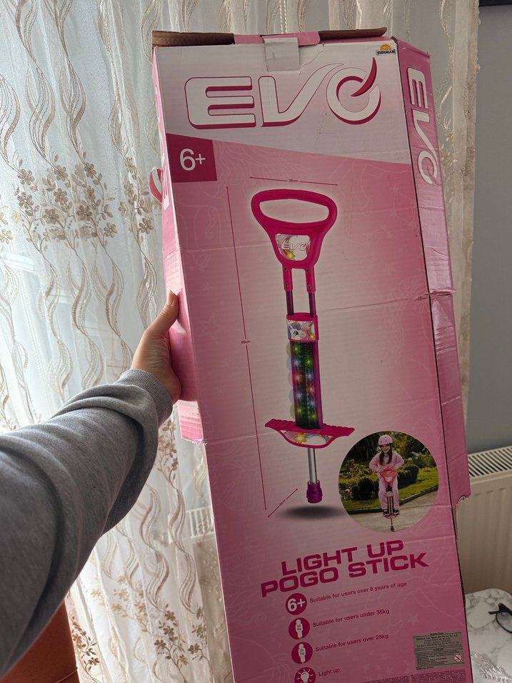 6 yaş ve üzeri çocuklar için pembe renkli, ışıklı pogo çubuğu. Hareketli oyunlar için uygundur. Hiç kullanılmadı. Kutuyu açtı kızım sadece. Altının temizliği de belli oluyor.