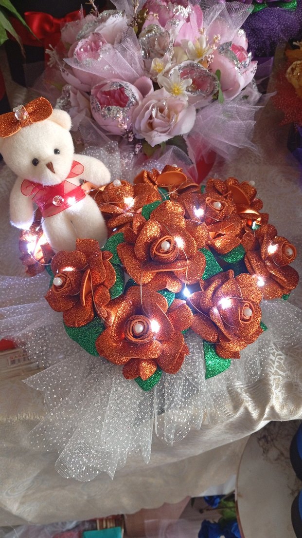 Işıklı, simli kahverengi güllerden oluşan renkli bir buket. Yanında fiyonk takmış küçük peluş oyuncak ayı bulunur.