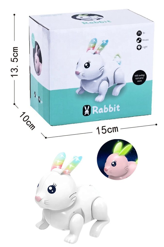 Işıklı ve müzikli, kuyruk ve kulakları sallanan beyaz tavşan oyuncak. Yaklaşık 15 cm uzunluğundadır kutulu kullanılmamış.