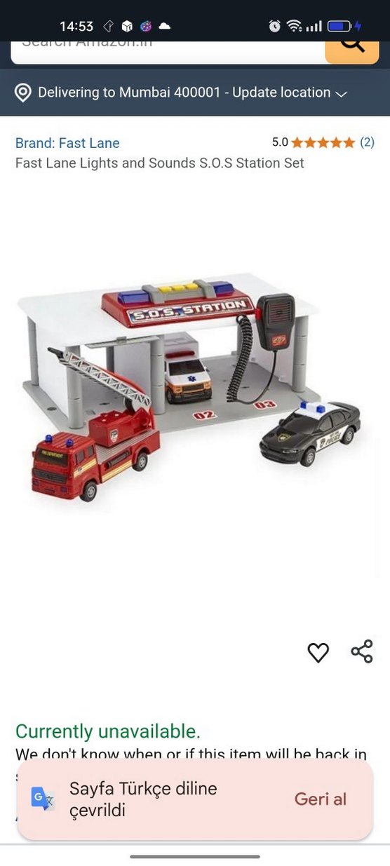 Gri renkte ışıklı ve sesli S.O.S istasyonu oyuncak seti, itfaiye, ambulans ve polis araçlarıyla birlikte gelir.sari tuşlara basınca bu araçların sesleri gibi siren sesi çıkıyor.siyah aparatın arkasındaki mandal kırık sadece başkaca boş sorunu yok