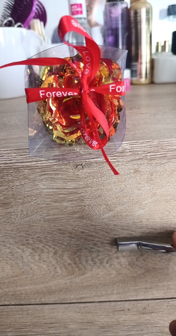 Kırmızı kurdeleli, 'Forever Love' yazılı dekoratif kırmızı ve altın renkli
