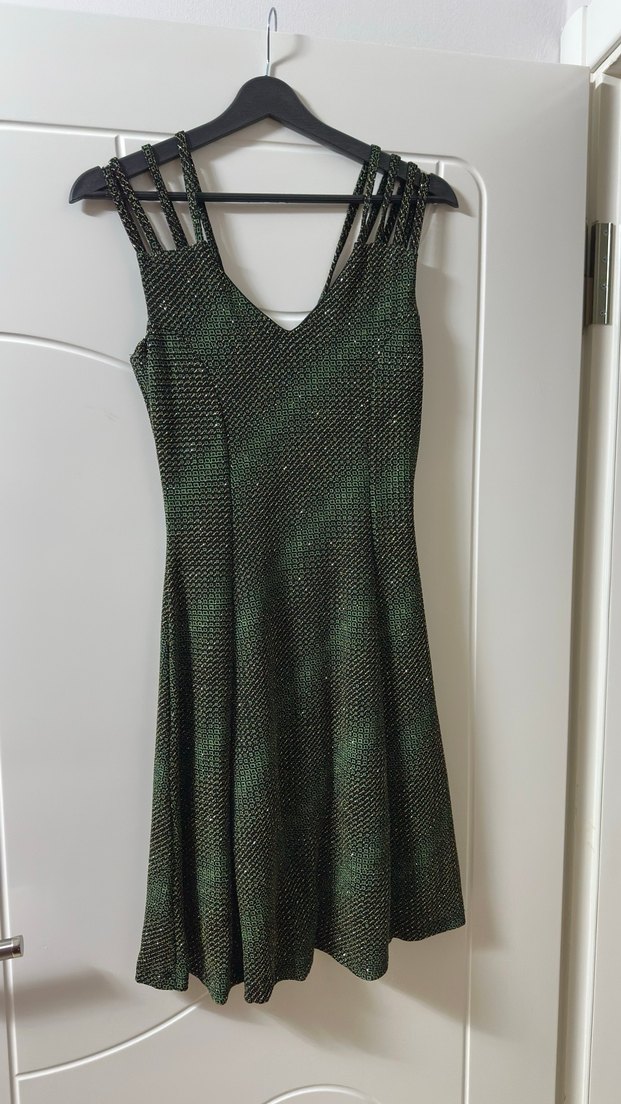 V yaka ve ince askılı, yeşil ve ışıkta kırılan mini abiye elbise. Fitted kesimiyle avant-garde tarzı yansıtıyor. Üzerindeki parlaklıklar kumaşından herhangi bir taş değildir, simli kumaş gibi ama simleri dökülmüyor.