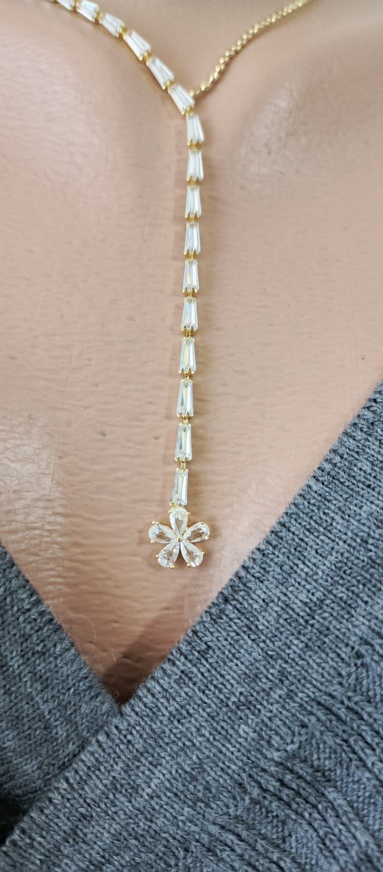 Altın rengi, detaylı zincir ve çiçek şeklinde taşlı uçlu, günlük kullanıma uygun bohem tarzda kolye. Çeliktir kararma yapmaz.