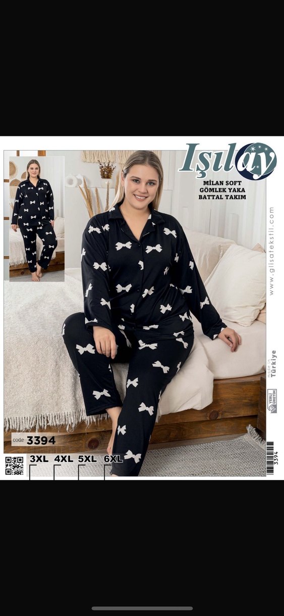 Isilay marka, siyah renkli ve beyaz fiyonk desenli, uzun kollu, gömlek yakalı, bol kesim pijama takımı. Yumuşak ve rahat kumaştan üretilmiştir. 6XL bedeni mevcuttur.