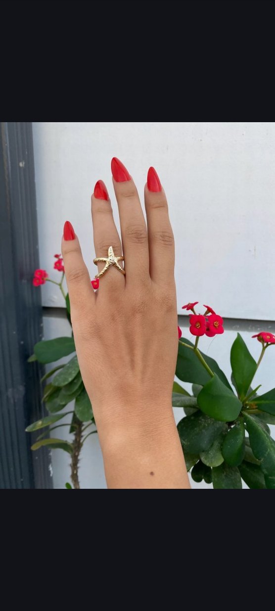 Altın renkli, payet detaylı deniz yıldızı desenli yüzük. Düğünler için cesur ve çağdaş bir şıklık katıyor.