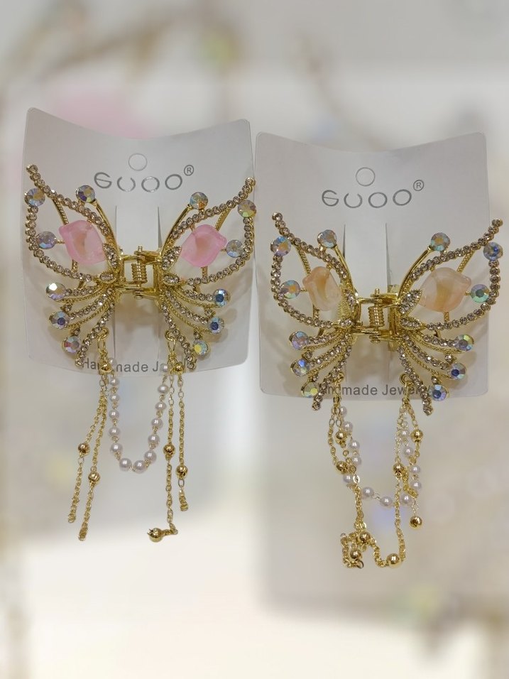 Işıltılı altın renkli, pembe detaylı fiyonklu saç tokaları, zincir süslemeleriyle göz alıcı ve bohem tarzda.