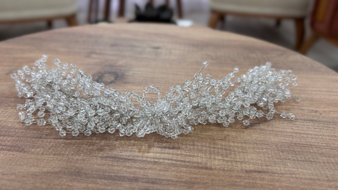 Işıltılı payetlerle süslenmiş, çağdaş ve şık tasarıma sahip açık bej renkli gelin tacı.