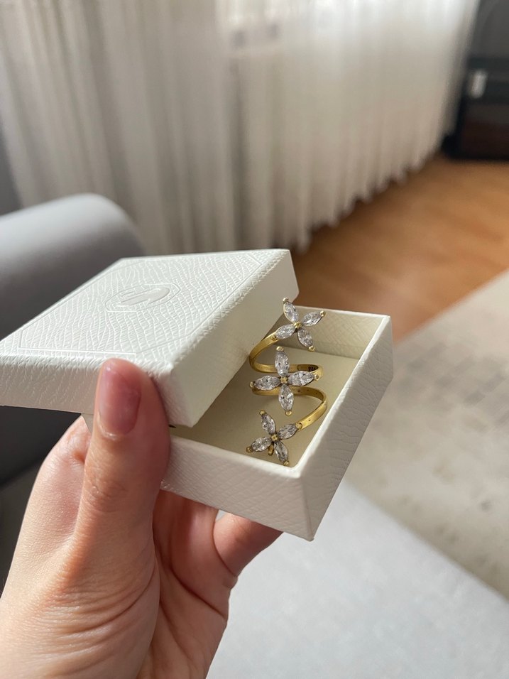 Modern klasik tasarıma sahip bu kadın yüzük, beyaz ışıltılı çiçek desenleriyle düğünler için uygundur. Minimalist ve zarif bir stil sunar. Hiç kullanılmadı