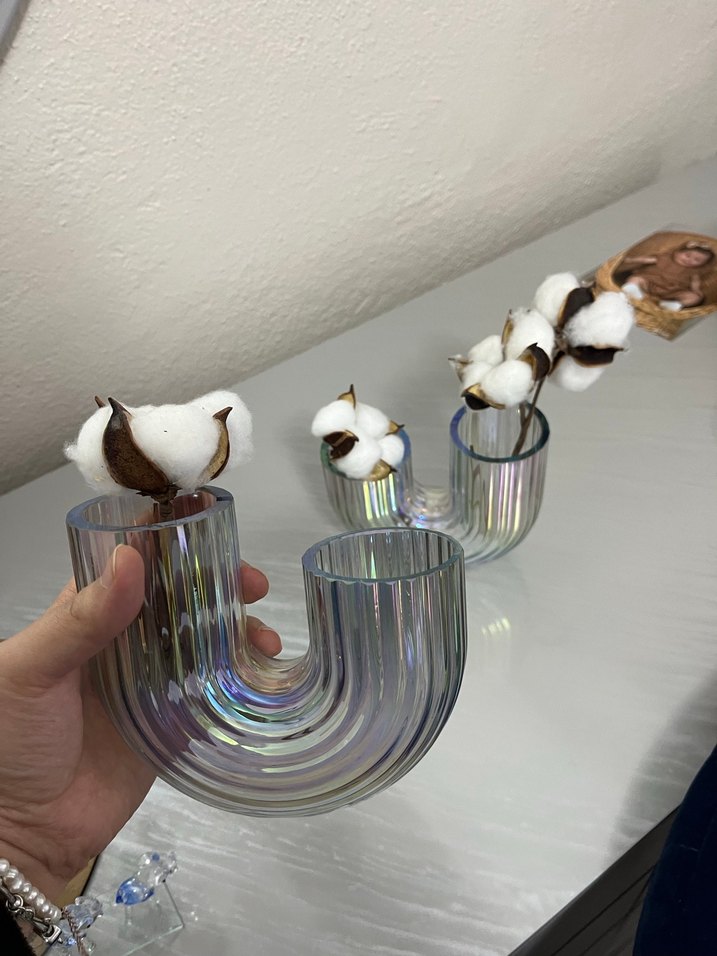 Işıltılı yüzeye sahip beyaz U şeklinde iki adet vazo ikea