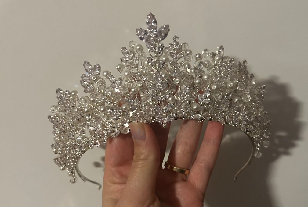 Tepesine doğru yükselen ve tepesinde zirkon yaprak taş detayıyla biten bol boncuklu ve taşlı hem şık hem zarif gelin tacı. Bir kere kullanıladı. Gayet iyi durumda.