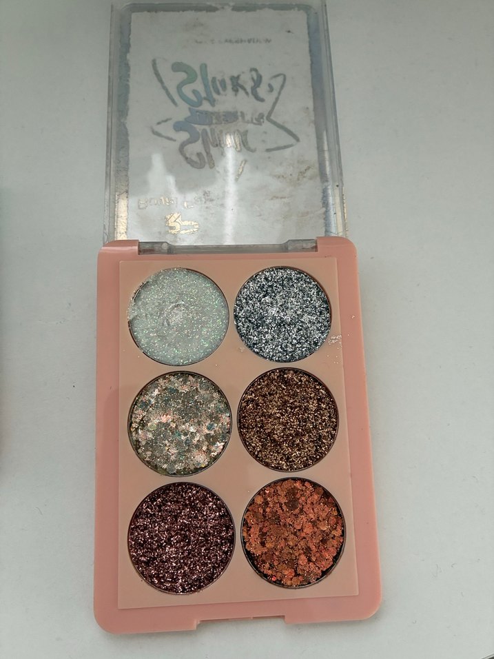 Altı ışıltılı ve parıltılı gölge tonundan oluşan renkli far paleti, canlı göz makyajları için uygundur. ✨