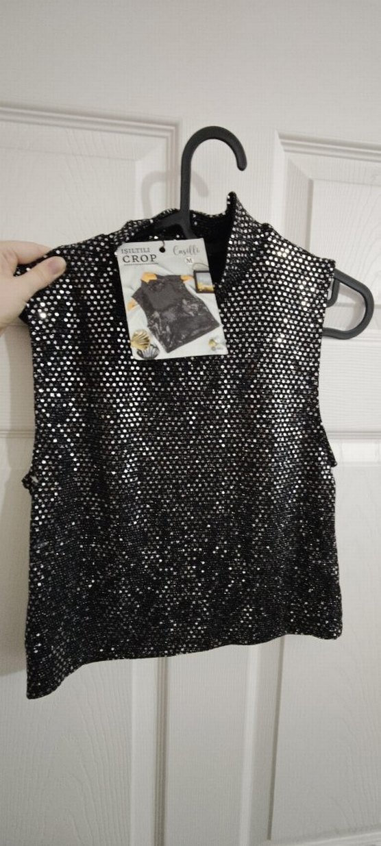 Siyah payetlerle kaplı, dar kesim, kolsuz ve yüksek yakalı bu yelek sentetik kumaştan üretilmiştir. Avant-garde tarz ve parti için uygundur. ✨