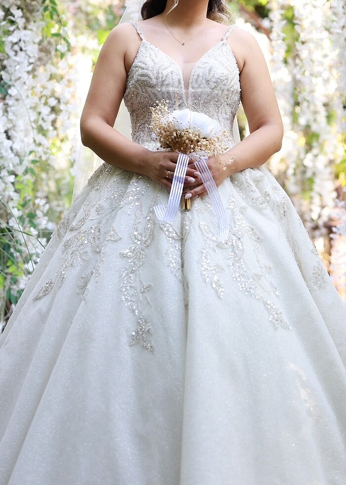 Renk kırık beyazdır. Sadece 2 saat kullandım Sıfır yeni alındı Full simli Bedeni 38 fakat ben arkasına kapak yaptırdım isterseniz çıkartılabilir 44 bedene kadar uyumludur ben 77 kilo olatak giydim onu bir sıkıntı yaşamadım Ön dekoltesine tül taktım isterseniz çıkartabilirsiniz.