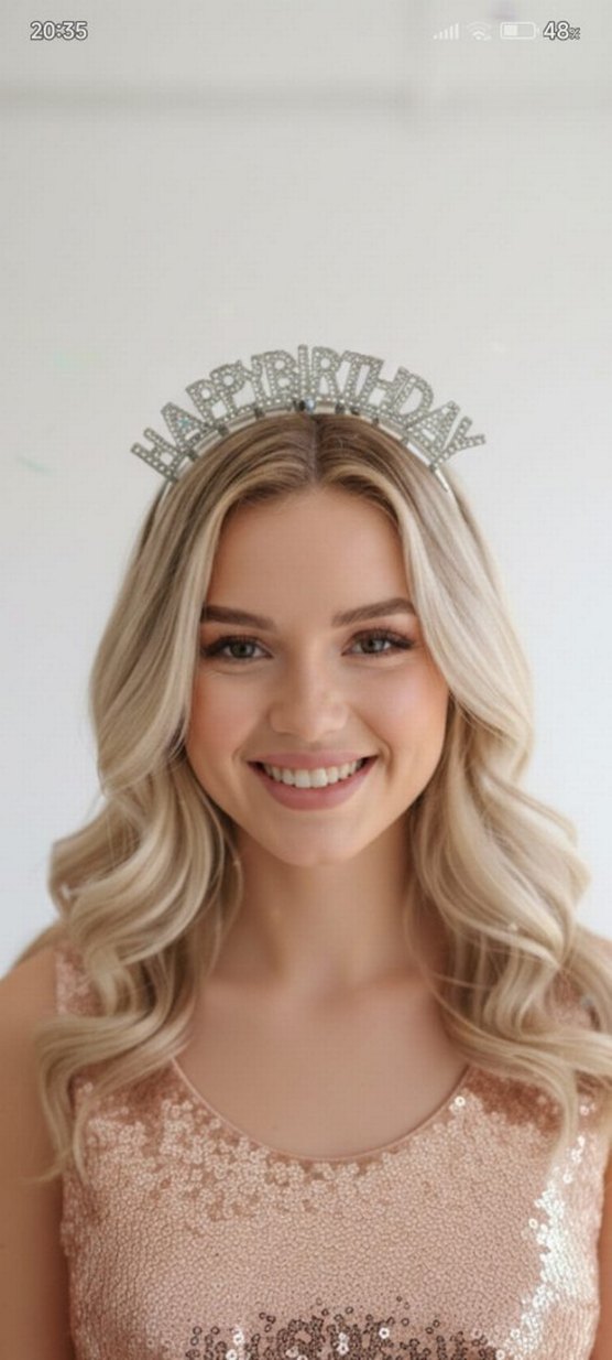 Pullu harflerle "Happy Birthday" yazılı, bej renkli metal saç aksesuarı. Çağdaş tarzı bohem ve retro havasıyla birleştirir. Kutlamalar için ideal .
