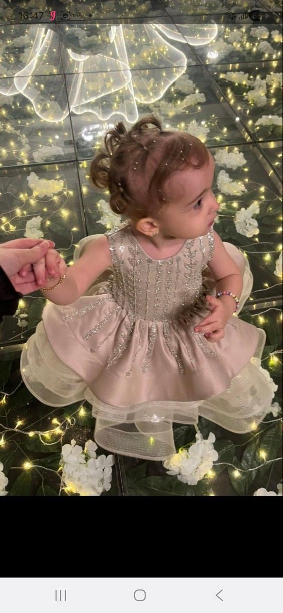 Işıltılı işlemelerle süslenmiş, askısız krem renkli kız çocuk elbisesi. Sentetik kumaştan, bohem tarzda ve vücuda oturan kesime sahip. ✨2 yaş özel dikim
