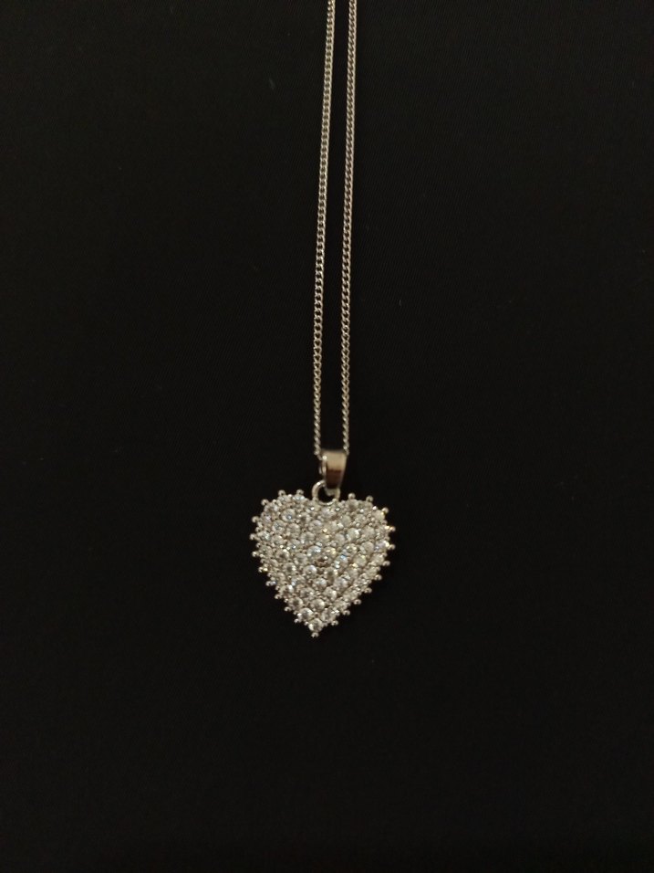 Gümüş renginde, payetlerle süslenmiş kalp şeklinde kolye ucu olan modern klasik tarzda kolye. Romantik akşamlar için uygun.
