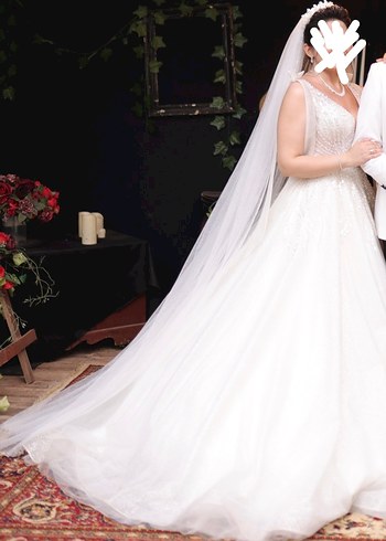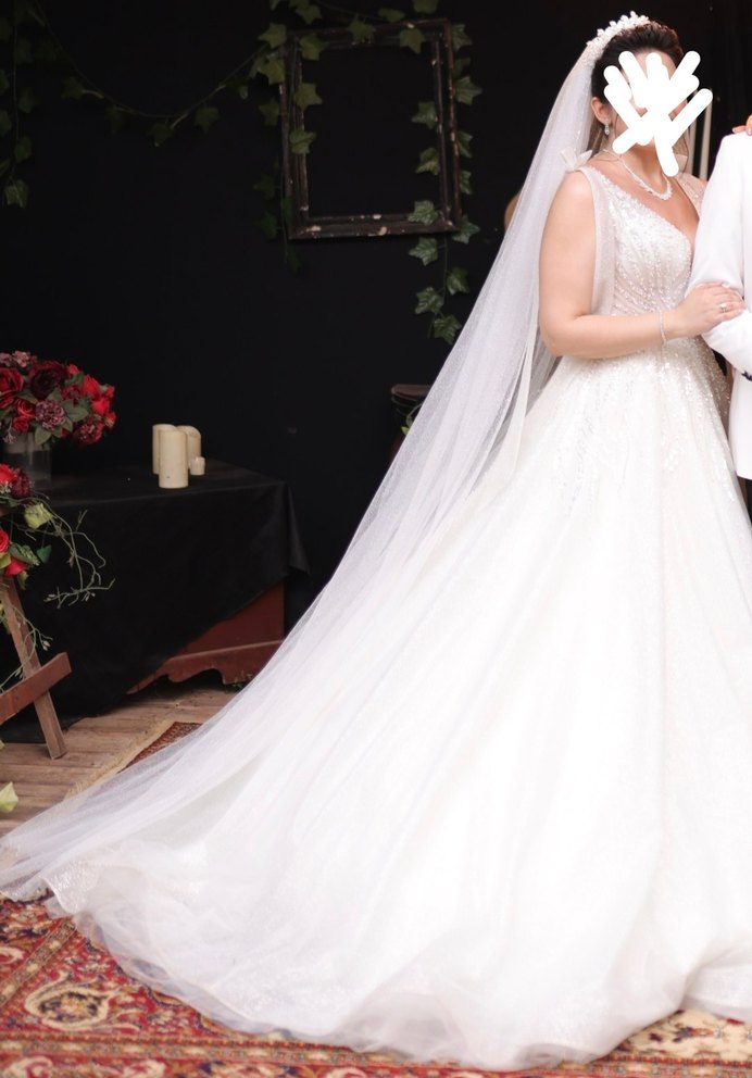 Belinizi incecik yapan kendinden korseli, içten dikili tarlaranlı, giyimi kolay, A kesim, salonun azıcık ışığına rağmen ışıl ışıl parlayacağınız ektra simli tül eklenmis aysira marka gelinliğimen son fotoğrafa eklediğim etiketindeki ürün kodu ile mağazadan gidip deneyebilirsiniz. Şuan sayfasında aynı modelin after parti için satışı da mevcut dilerseniz üst duruşunu görmek için onu da deneyebilirsiniz. Gelinlik boyundan hiç kesim yapılmamış olup yüksek topuklu ile giyilmiştir. Kollarından sarkan kurdeleler çıt çıtlı olup çıkartılabilir. çıkartılmış halinin fotosunu ekledim. 1 adet hiç kullanılmamış inci işlemeli 1 adet düğün günü fotoğraflarda görünen kendi kumaşından simli olmak üzere 2 adet uzun boy duvak yanında hediye gönderilecektir. 1 kere kapalı düğün salonunda giyilmiş olup kuru temizleme yapılmamıştır. dileyen satın aldıktan sonra yaptırabilir. Ben içinde kendini prenses gibi hissettim. Dilerim alacak kişide öyle hissetsin şimdiden hayırlı olsun☺️
