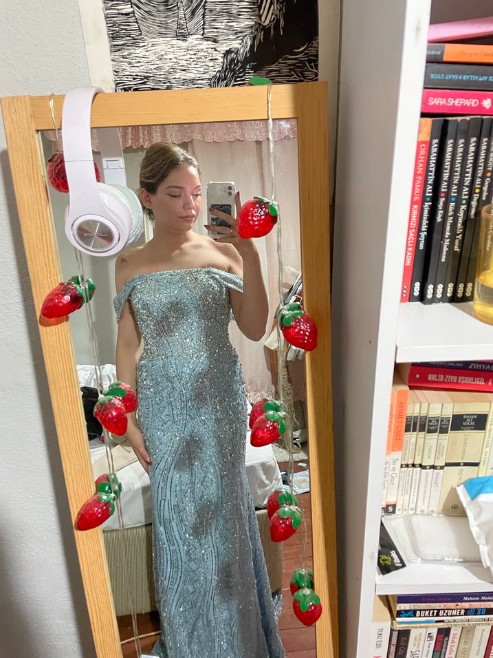 Işıltılı detaylara sahip, straplez ve vücuda oturan açık gri uzun abiye elbise. Bohem tarzda, kolsuz ve düğünler için uygun. ✨ taşları ve elbise sağlam herhangi bir sorunu yok. Kuru temizleme yapılıp hurç ve britiyle birlikte gönderilecektir.