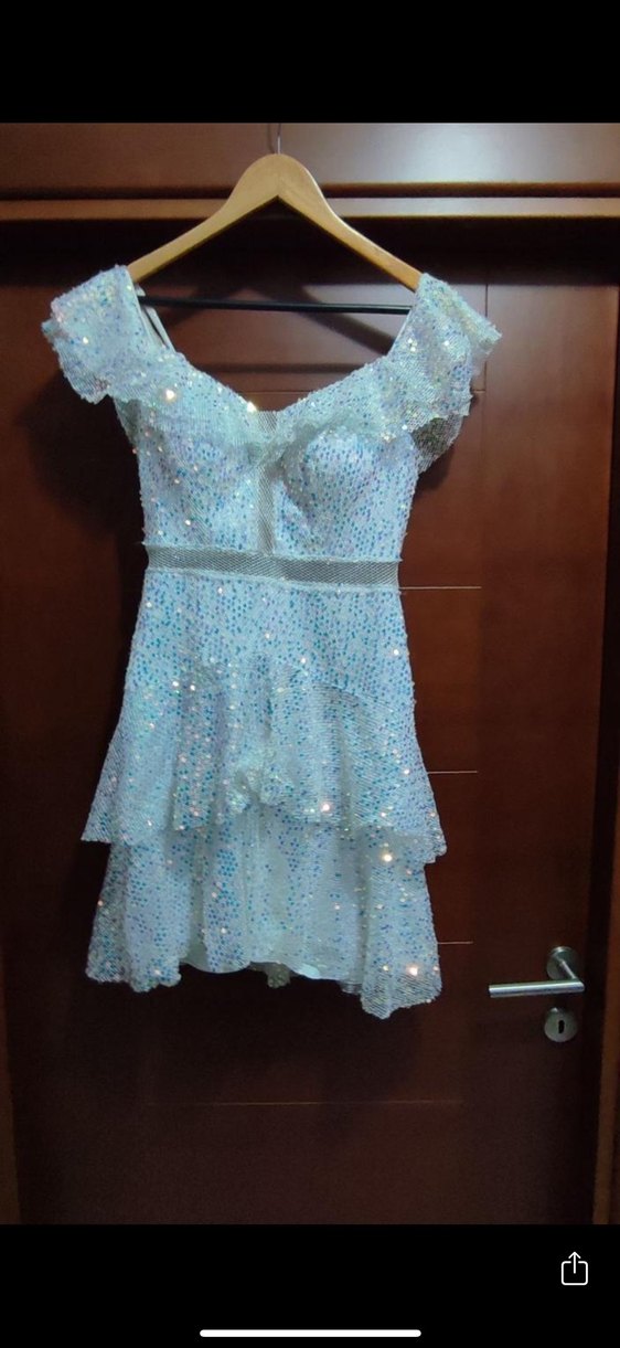 Işıltılı, işlemeli mavi kumaştan yapılmış, abiye elbise. Farklı ve şık bir bohem tarz sunar. ✨