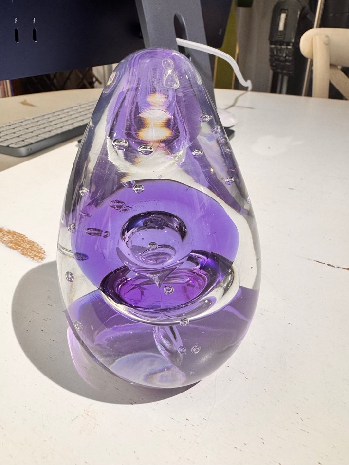 Bu mor cam vazo, ışık mor tonlarında ve içinde hava kabarcıkları bulunan şeffaf, pürüzsüz bir tasarıma sahiptir. Zarif şekliyle dikkat çeker. Muranodur
