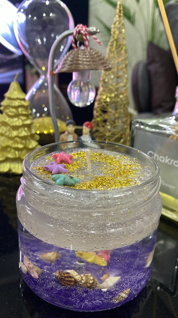 Işıltılı altın simli, deniz kabukları ve renkli yıldız süslemeleriyle mor jel mum. ️